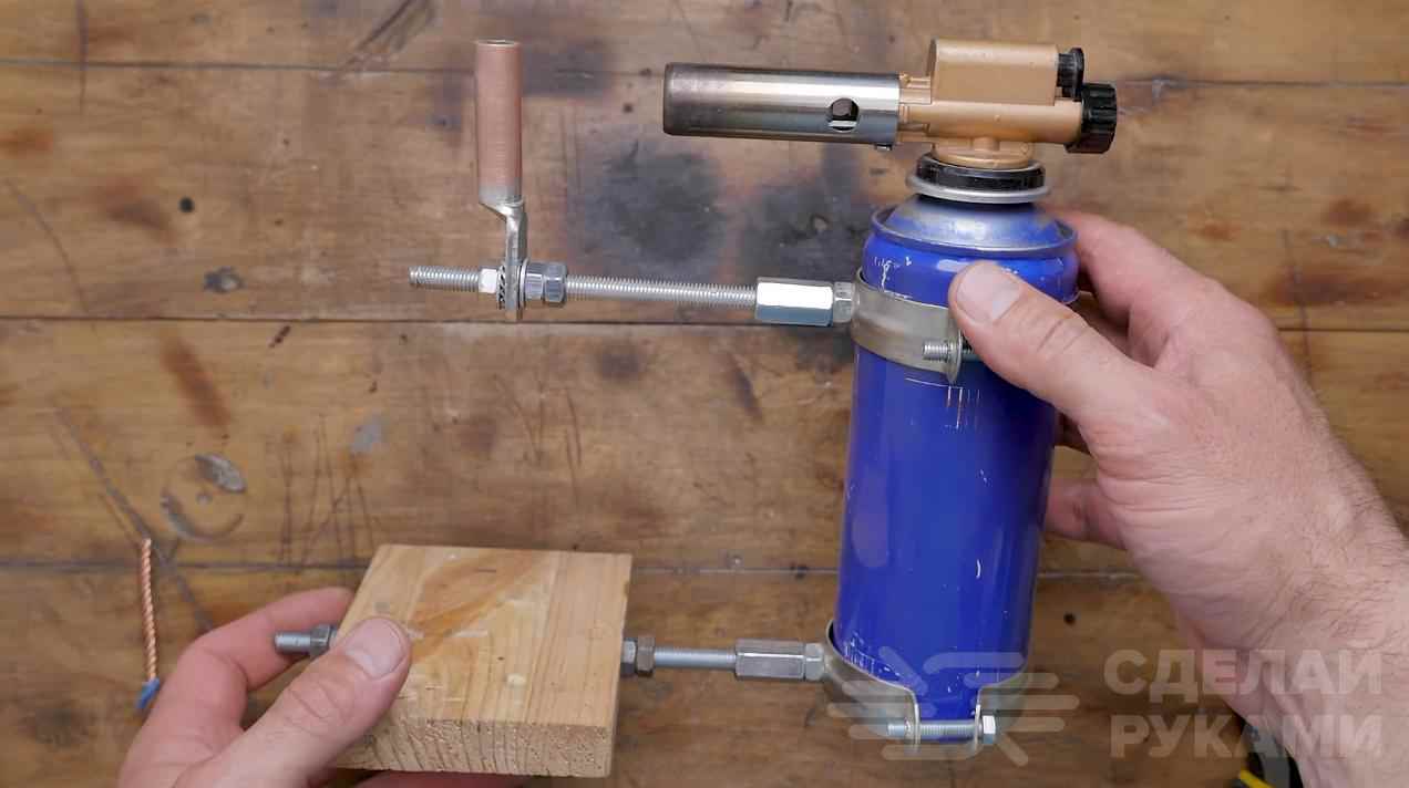 Для изготовления данной самоделки потребуется газовый баллончик с горелкой, металлический хомут для канализационных труб диаметром 50 мм, шпилька М8 и медный кабельный наконечник.