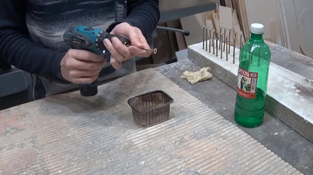 На следующем этапе необходимо сделать разметку, чтобы вырезать в заготовке прямоугольное «окно». По краям контура разметки автор сверлит отверстия, чтобы удобно было вырезать болгаркой.