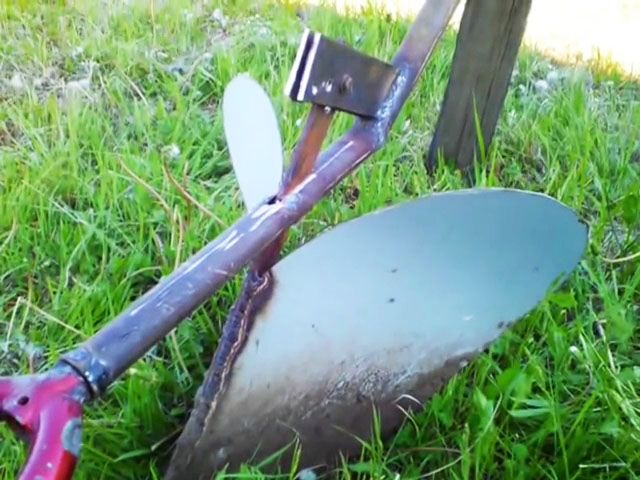 Теперь останется только заточить режущую кромку на самой «насадке», и самодельный инструмент для дачи полностью готов к работе.