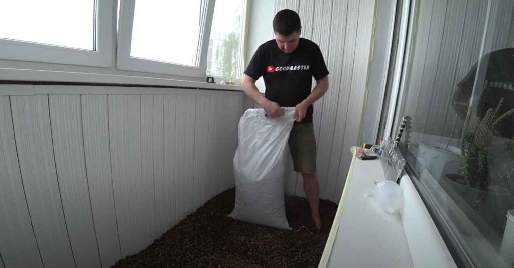 Кстати, в данном случае мастер высыпает керамзит прямо на старое напольное покрытие, не демонтируя его.