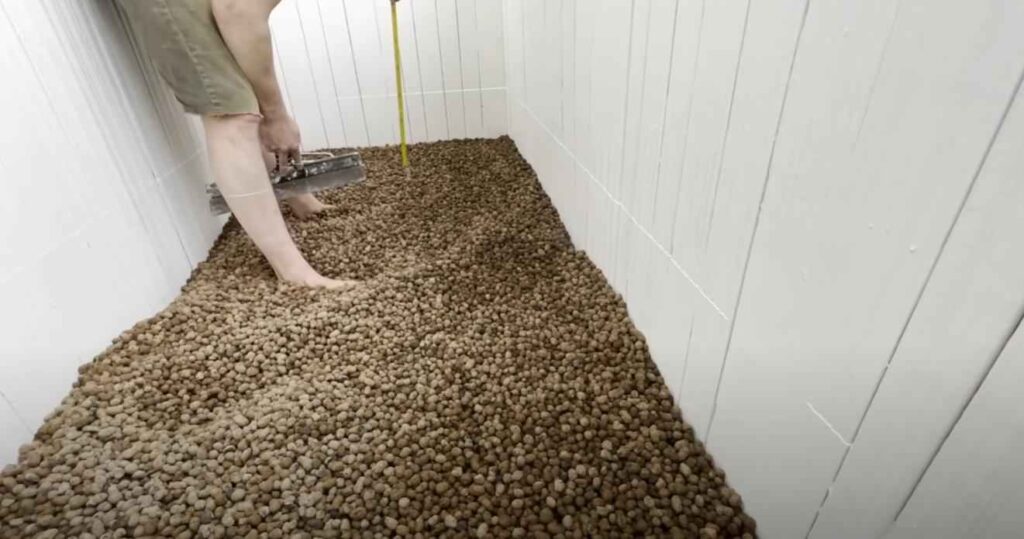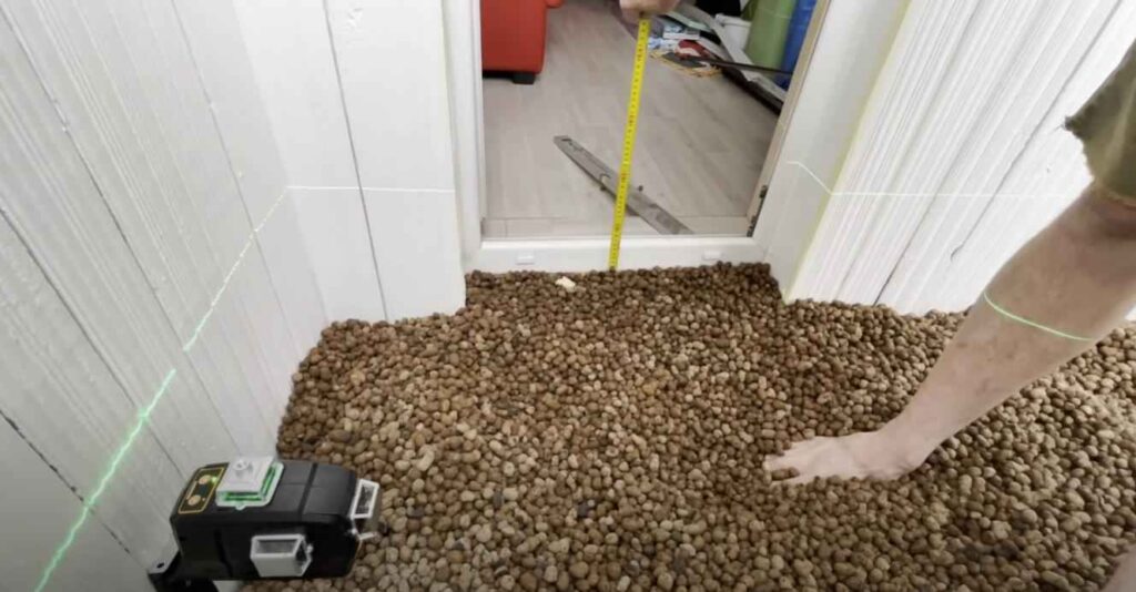 После того как высыпали керамзит на пол, необходимо его разровнять.