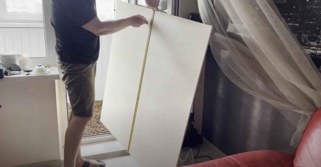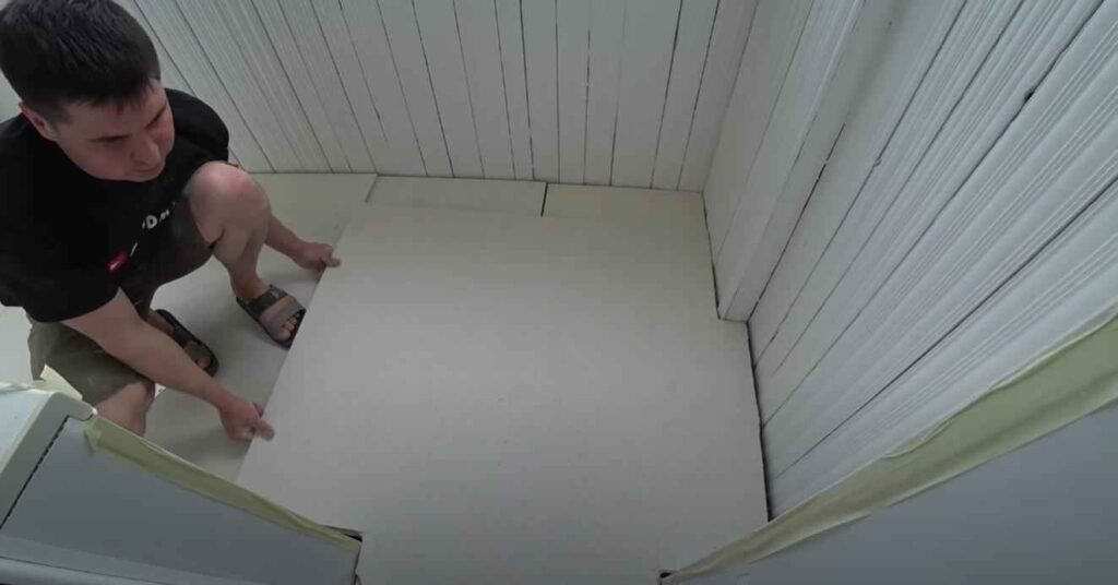 На следующем этапе рулеткой отмеряем расстояние от стены до стены, и отрезаем кусок гипсоволокнистого листа подходящего размера (толщина листа — 10 мм).