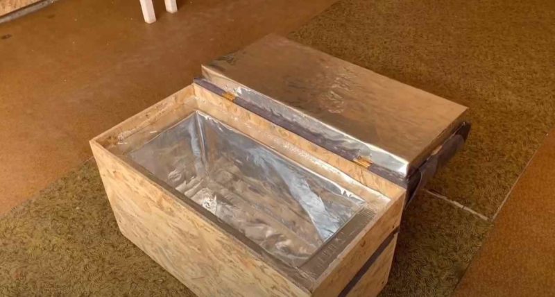 На последнем этапе останется только сделать крышу. Для этого мастер использует два листа фанеры. Листы крепятся к металлическому каркасу при помощи петель.