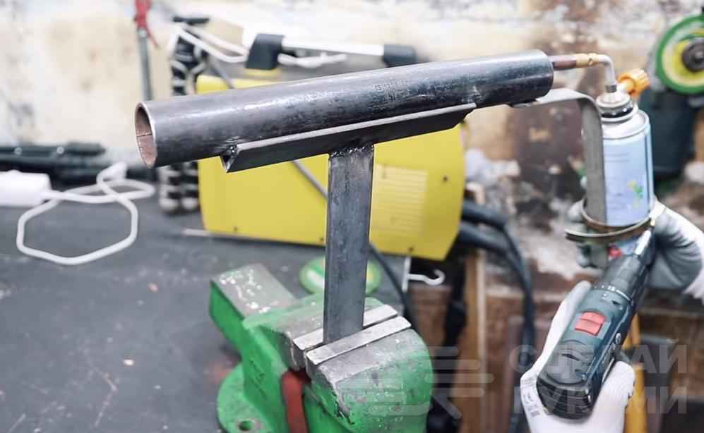 Далее мастер сверлит в трубке два отверстия диаметром 4 мм, между которыми необходимо сделать паз. Сначала по прямой линии, а потом дополнительно надо будет еще сделать по два ответвления с каждой стороны.