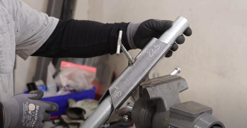 На следующем этапе мастер отрезает два отрезка трубы диаметром 25 мм (длина каждого отрезка — 50 см). Также потребуются два отвода диаметром 25 мм, которые надо будет сварить вместе.