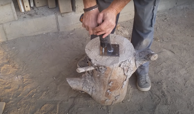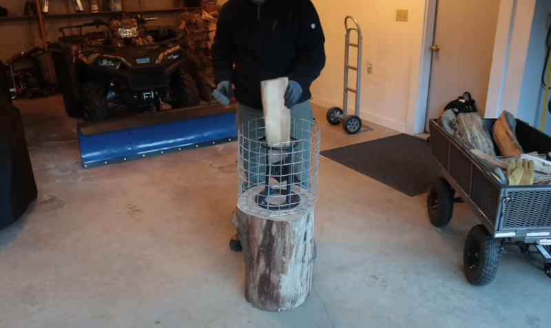 Бензопила с этой задачей справится быстрее, но автор все же использует именно это приспособление. То есть получается как бы универсальное устройство «2 в 1» — и дровокол, и деревокол.