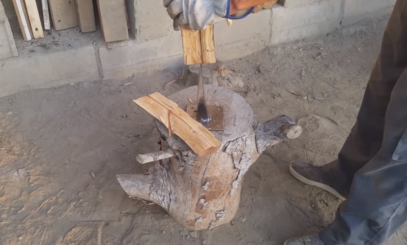 Устанавливаем полено на нож из пластины, после чего ударяем по нему тяжелым молотком или кувалдочкой. Можно использовать для этого другие тяжелые предметы — например, кусок стальной трубы.