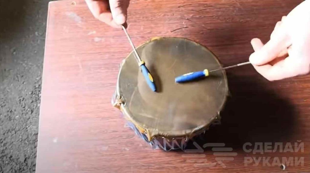 В нижней части шара автор делает отверстия, через которые вода из чаши будет снова попадать в резервуар. Устанавливаем фонтан на участке и наслаждаемся проделанной работой.