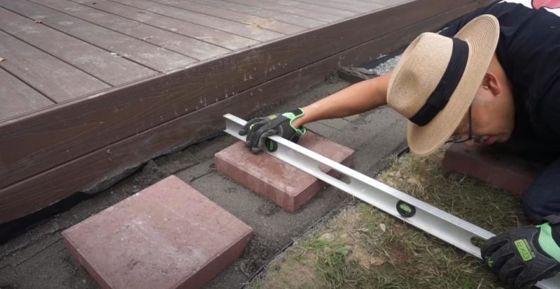 После укладки первого ряда, начинаем укладку второго. Его нужно начинать не с целой доски, а куска длиной 40-50 см, а потом чередуем последующие ряды в шахматном порядке.