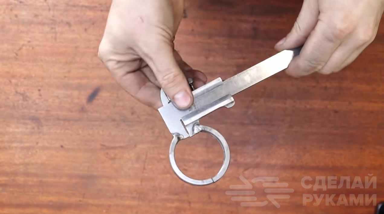 Размеры «пробойника» могут быть разными, в зависимости от того, какой длины должны быть щелевые отверстия в листе металла. К примеру, в данном случае ширина лопатки составляет 10 см, а длина вместе с ручкой составляет 15 см. Толщина фанеры — 20 мм.