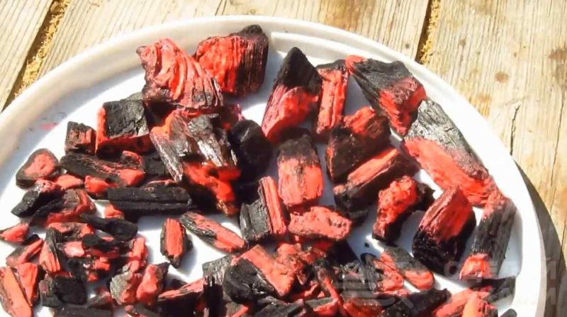 Первым делом необходимо отобрать примерно одинаковые по размеру древесные угли. Берем кисточку и покрываем их слоем акрилового лака. Дожидаемся, пока лак высохнет.
