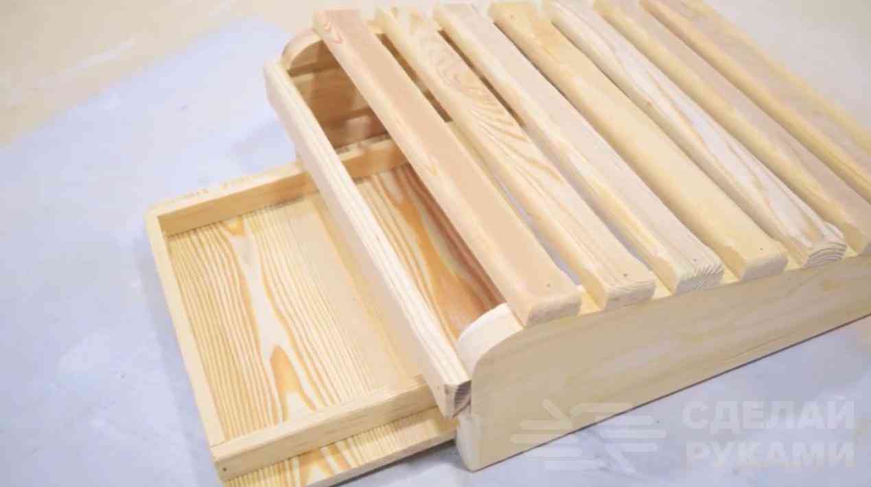 Затем нужно отрезать две деревянных рейки шириной 5 см и толщиной 2 см. Длина заготовок — по 24 см.