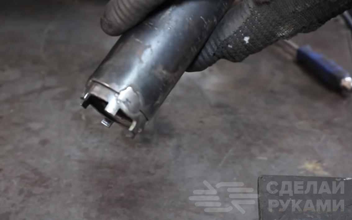 Далее подготовим патрон для зажима гибкого вала. На втулку патрона привариваем гайку по диаметру равную валу УШМ. Закрепляем наш патрон на УШМ. Собираем все части самоделки вместе и наслаждаемся продолжением выполнения своего заказа.