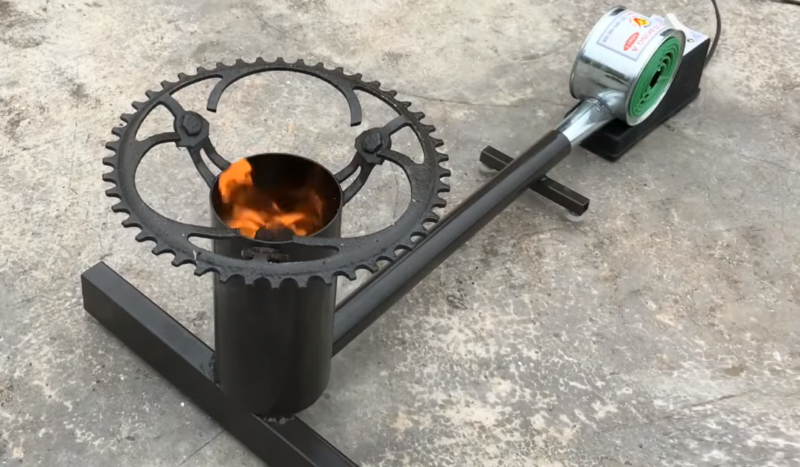 На конце воздуховода закрепляем вентилятор, который будет нагнетать воздух в камеру горения. Самодельная печь готова! Сверху камеры горения устанавливаем подставку для посуды.