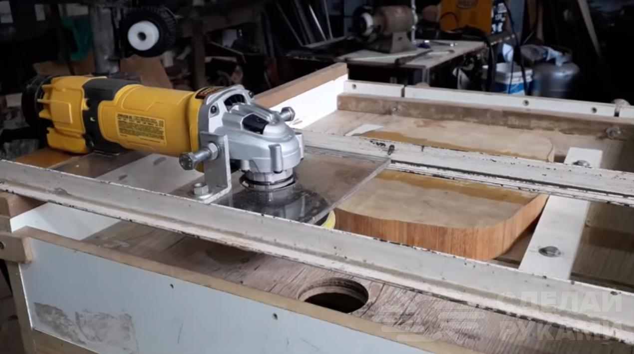 Кромку автор обрабатывает ручным фрезером, потом еще раз надо хорошо отшлифовать поверхность. Далее нужно будет отпилить две рейки, и приклеить их к нижней части подставки.