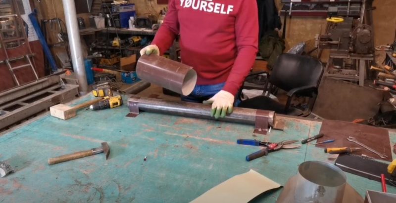 К верхней части вертикальной трубы привариваем огнетушитель, предварительно обрезав горловину. Дно огнетушителя также отрезаем, а потом крепим с помощью мотоциклетной цепи. Также надо будет установить защелку для крышки.