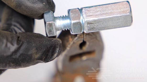 Затем к двум подвижным элементам конструкции надо будет приварить по две шестигранных гайки, которые нужны для крепления самодельного рычажного механизма.