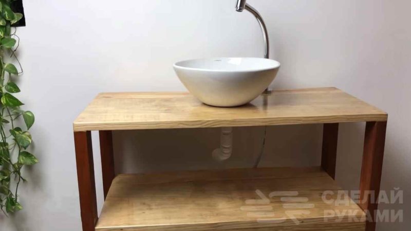 В завершении останется лишь просверлить в столешнице отверстия под слив и для подвода воды. Столешницу и полку тумбы покрываем лаком, чтобы защитить их от влаги. Устанавливаем раковину и смеситель.