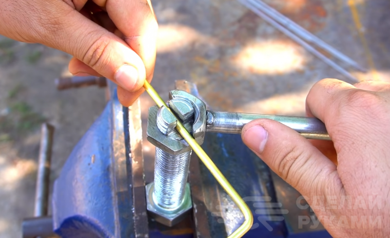 Вставляем хвостовую часть ножа в рукоятку, надеваем обжимную «обойму» из куска листовой латуни и фиксируем поворотным штифтом, изготовленным из толстой медной проволоки.