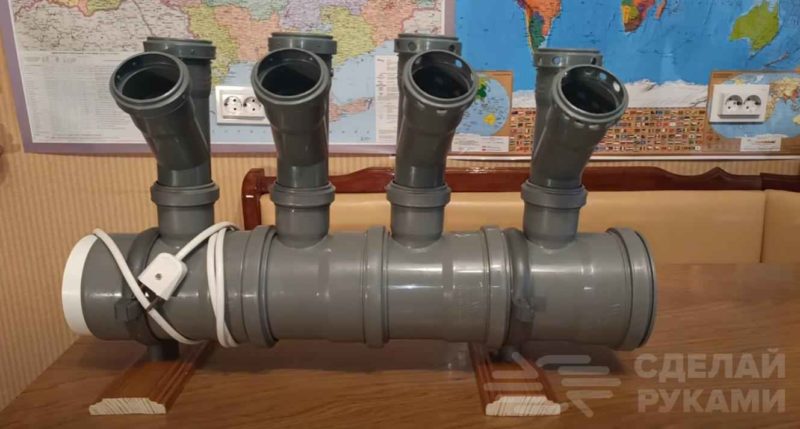 Далее вставляем тройники 50/50 мм, предварительно просверлив с одной из сторон отверстия — для лучшего рассеивания теплого воздуха.