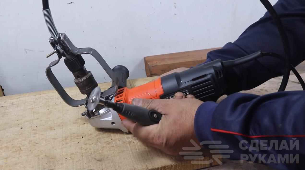 Для начала отрежем небольшую полосу металла и по центру выберем при помощи УШМ небольшое количество металла. Сгибаем в тисках заготовку до получения уголка в 90 градусов.