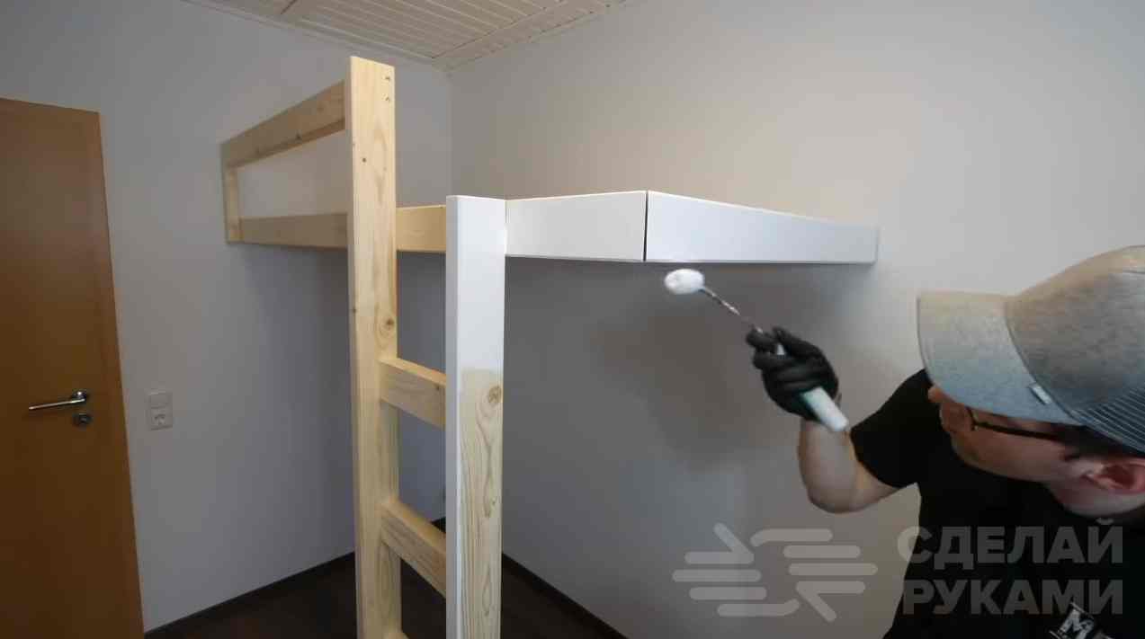 Собираем каркас будущего спального места и крепим к нему лестницу. Также надо будет сделать ограждение в изголовье кровати.