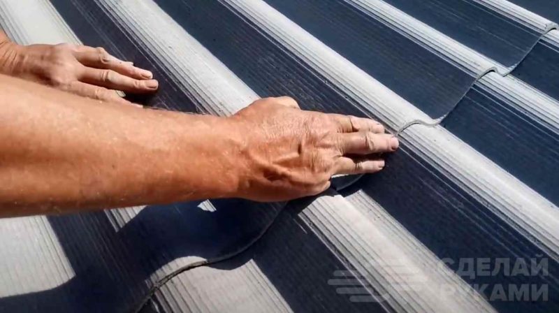 На подготовленную поверхность шифера наносится слой силикона. Сверху укладывается кусок ткани, и замазываем его верхнюю часть тем же силиконом.