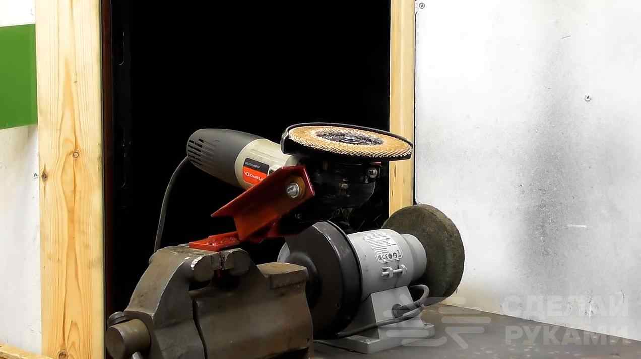 Благодаря этому приспособлению можно зафиксировать УШМ в нужном положении в слесарных тисках. Это удобно при выполнении шлифовальных работ.