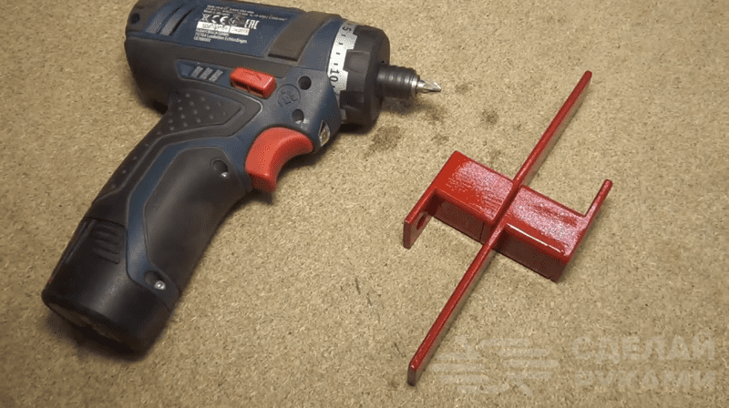 Теперь самоделка готова, попробуем ее испытать. Вставляем маленькую болгарку в хомут, который предварительно был продет через просверленное отверстие в профиле. Затем скрепляем ее болтом с профильной трубкой. Для этого вверху приготовлено сквозное отверстие. Затягиваем хомут и начинаем работать.