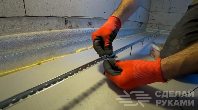 По центру каждой лунки устанавливаем резьбовую шпильку загнутым концом вниз. Выставляем шпильку по уровню.