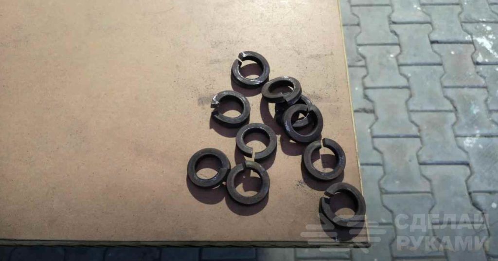 Получившуюся спираль крепим к столу, и болгаркой делаем в ней пропил. Самодельные гроверы готовы.