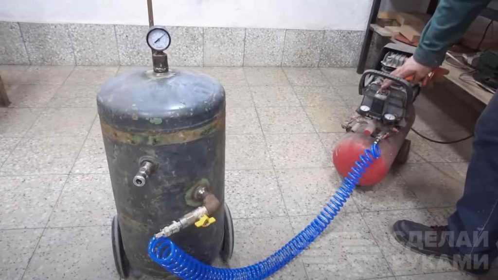 Подключаем газовый баллон к компрессору и накачиваем в него воздух — давление контролируем по манометру. Теперь можно использовать накопитель в гараже и мастерской.