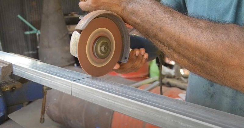 На следующем этапе мастер отрезает четыре одинаковых заготовки из профиля 15*15 мм длиной по 1,5 метра. Три отрезка идут непосредственно на вертикальные стойки, а четвертый — для круга в нижней части конструкции.