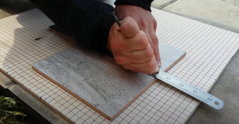 Далее по разметке необходимо срезать углы болгаркой с алмазным диском, чтобы потом можно было состыковать кирпичи между собой.