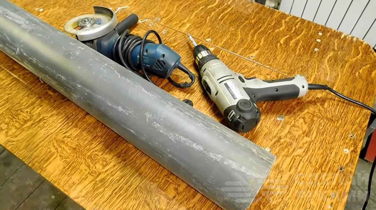 На следующем этапе работ в подготовленных отрезках профильной трубы нужно будет просверлить отверстия. После этого из куска металлической пластины мастер вырезает соединительный элемент.