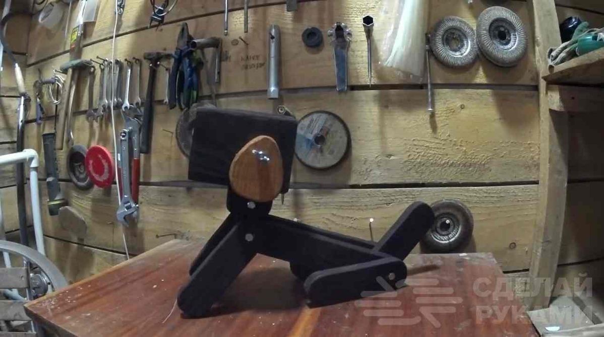 Когда основная часть готова, изготавливаем и крепим ножки. После этого делаем и устанавливаем деревянные подлокотники. Еще раз шлифуем поверхность болгаркой с лепестковым кругом, чтобы хорошо легло защитное покрытие.