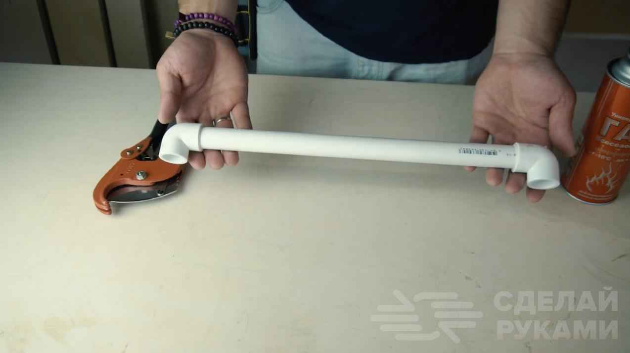 Потом останется лишь отрезать два куска полипропиленовой трубы нужной длины. На одном из концов автор делает с помощью болгарки прорезь.