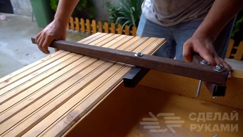 Принцип работы приспособления очень прост — вставляем стальную пластину между сменной насадкой и кондуктором, а потом давим на заготовку домкратом. В итоге получается уголок с углом 90 градусов с нужным радиусом закругления. Останется просверлить в нем отверстия, и можно крепить полки к стене или скреплять элементы мебели.