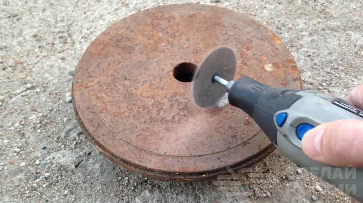 Далее мастер отрезает подходящий по длине кусок полена, сверлит по центру заготовки продольное сквозное отверстие, после чего в ход идет балеринка. Можно также кольцевую пилу использовать.