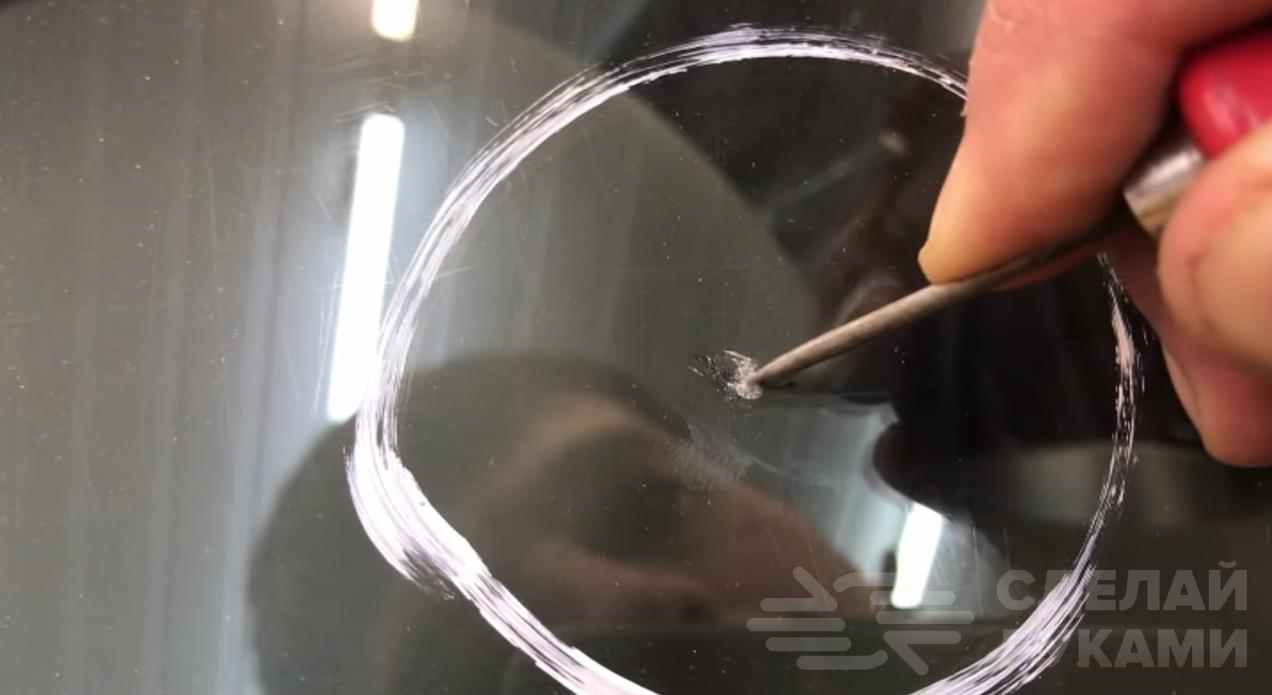 Самоделка готова — можно испытать ее в работе. Для этого приставляем приспособление к заготовке и отмечаем место для сверления отверстия.