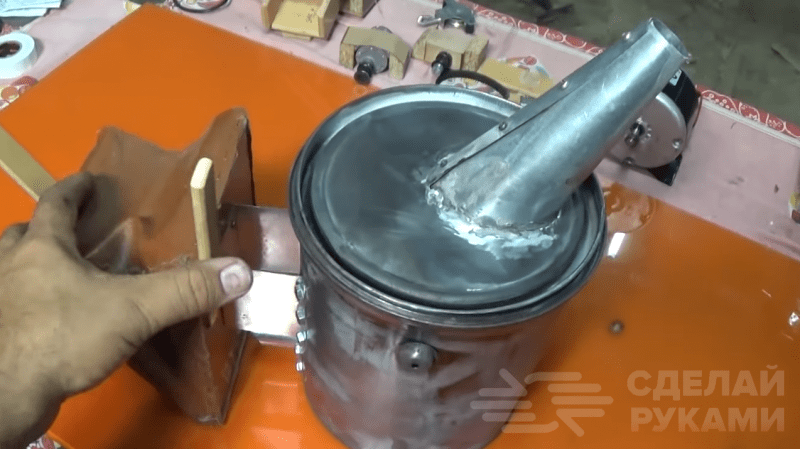 Первым делом необходимо сделать два сквозных отверстия: одно в крышке, второе — в емкости (в нижней части). Затем из листа нержавейки вырезаем кусок подходящей формы, чтобы можно было «скрутить» его в конус. В нижнюю часть ведерка вставляем кусок трубки (можно сделать из отрезка нержавейки).