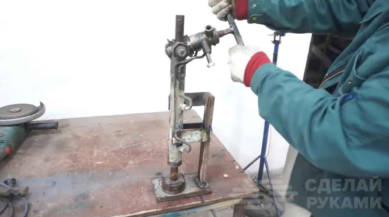 Первым делом необходимо почистить рулевую рейку с помощью щетки по металлу. Затем автор сваривает основание для самодельного пресса.