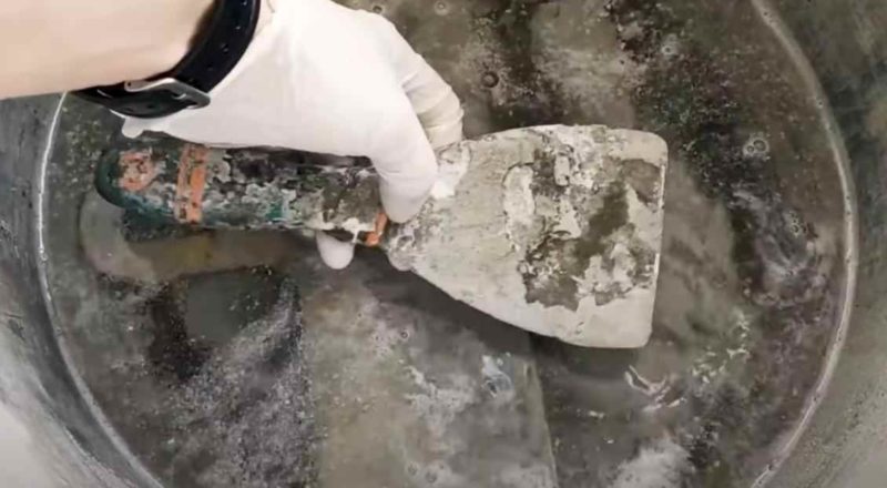 В результате остатки цементного или гипсового раствора намертво «прилипают» к поверхности инструмента, и после высыхания — голыми руками их уже не удалить.