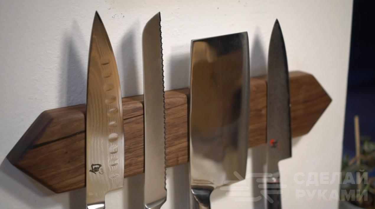 От широких кухонных ножей необходимо будет отрезать три куска с лезвием, которые будут использоваться в качестве режущих ножей. В каждой заготовке надо просверлить по два отверстия для крепления к разделочной доске.