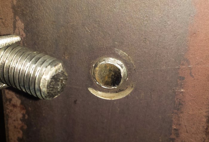 На следующем этапе подбираем стальную шайбу, прикладываем ее к торцу болта и привариваем через центральное отверстие.