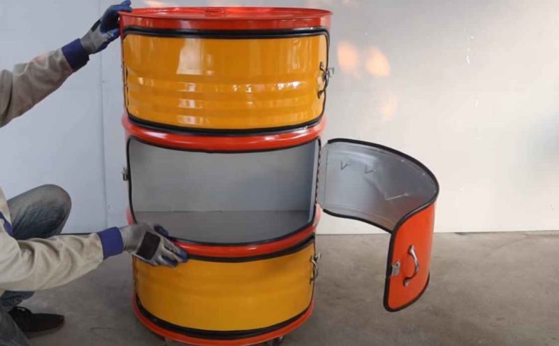 Из металлической бочки из-под масла (объем емкости — 200 литров) получится отличный мобильный шкафчик для хранения инструментов. Рассказываем, как сделать его своими руками.