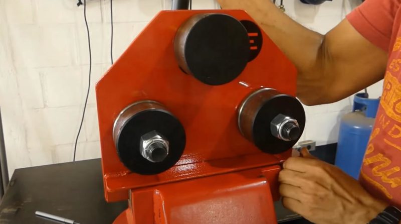В отверстия основания устанавливаем ролики на шпильки. Вкручиваем болты для фиксации в боковые отверстия и пробуем зажать нашу первую заготовку.