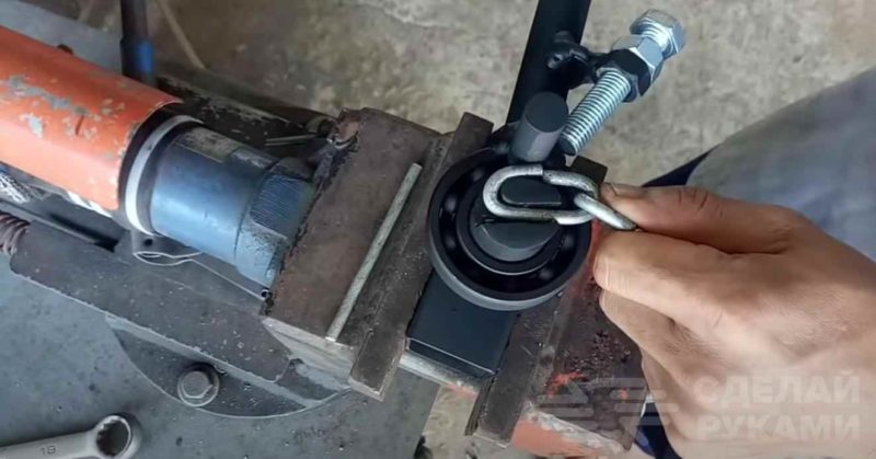 Также из двух отрезков профиля автор делает опоры для корпусных подшипников. В профильных трубах нужно просверлить отверстия и вварить в них шпильки.