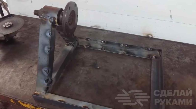 Потом из отрезков уголка свариваем основание. Привариваем к нему стойку с втулкой. Устанавливаем обратно шпильку с фланцем, затягиваем гайкой.