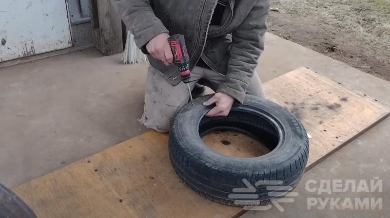 На следующем этапе нужно будет вывернуть автомобильную покрышку внутренней стороной наружу.